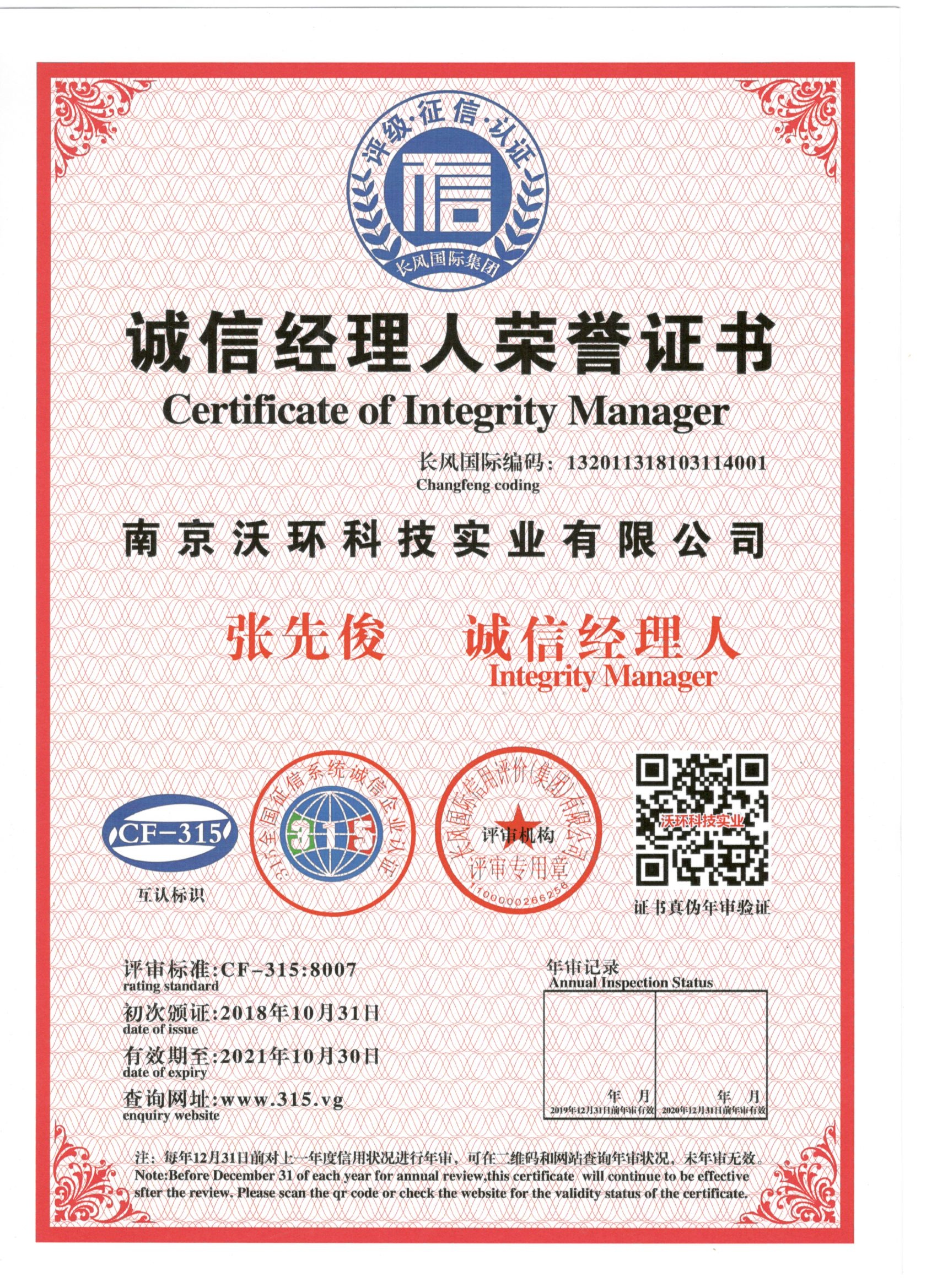 熱烈祝賀南京沃環(huán)公司張先俊先生被專業(yè)評審機構(gòu)-長風(fēng)國際集團(tuán)評為誠信經(jīng)理人,特發(fā)此證書